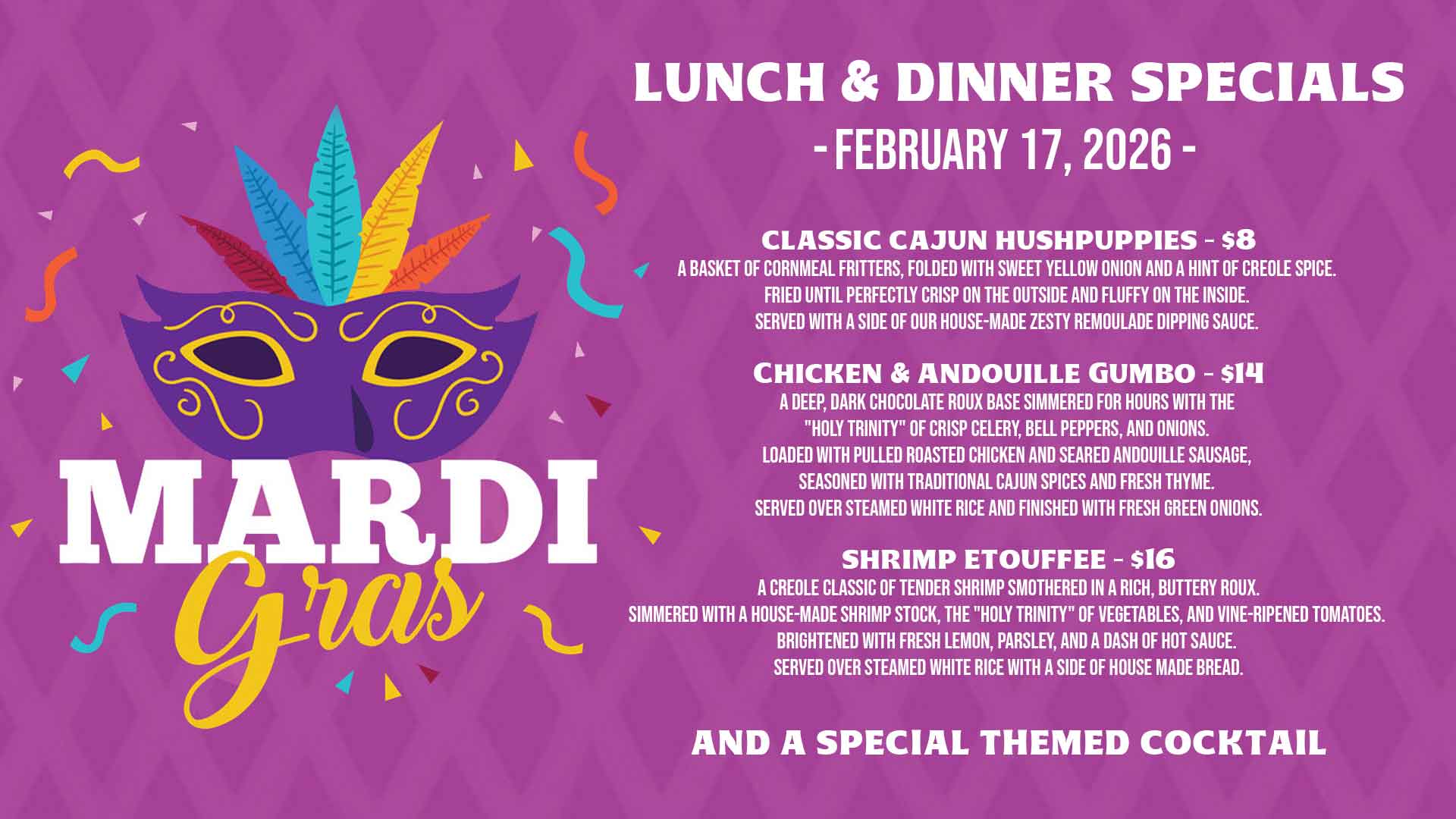 Get ready to let the good times roll! Come celebrate our Bayou celebration with a special one-day-only lunch and dinner special, along side our regular menu! From 11AM to 7:30PM, enjoy the bold, authentic flavors of New Orleans right here … Read More