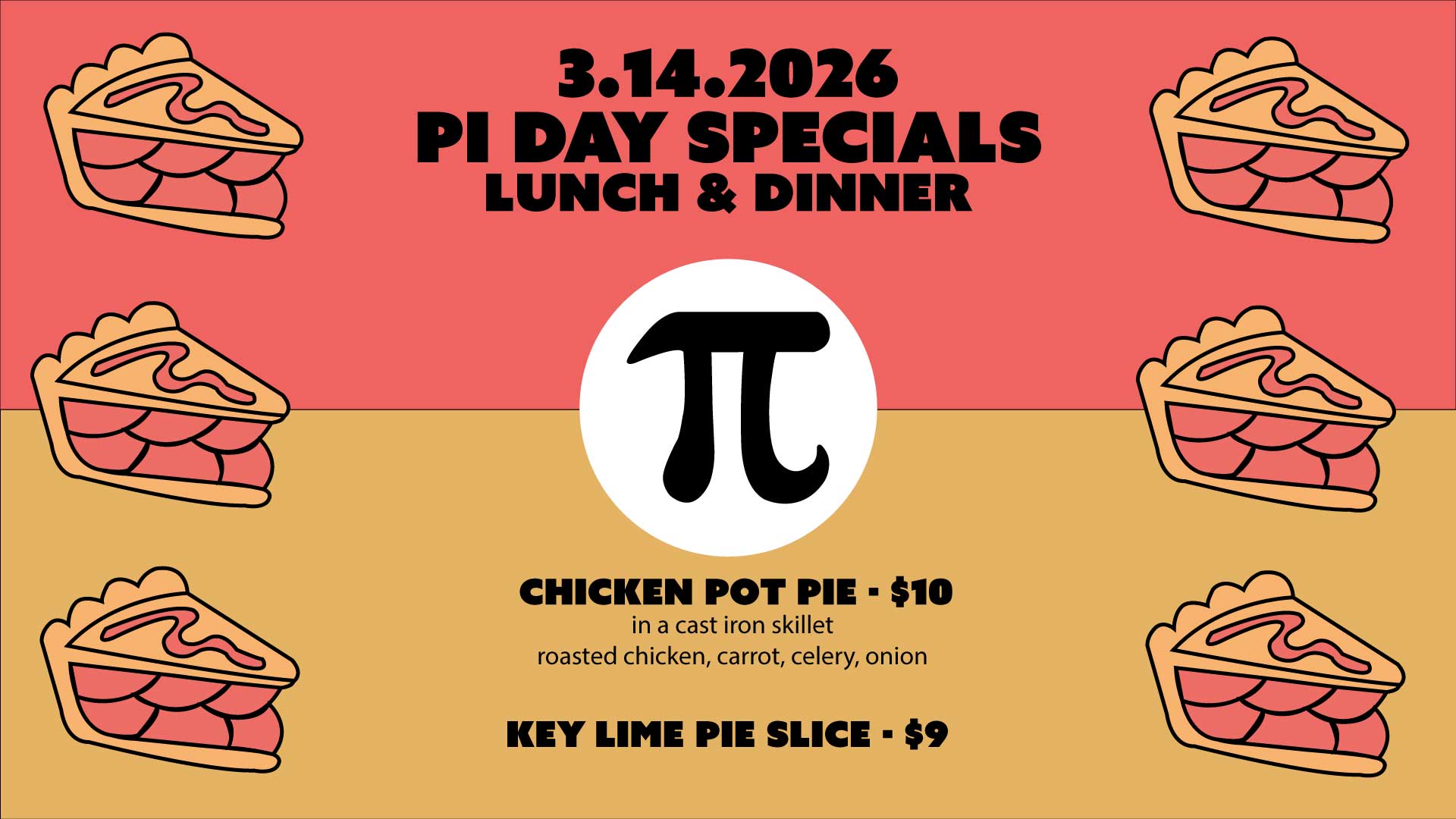 Happy Pi Day! Join us on 3.14.2026 for lunch & dinner as we celebrate the most delicious day of the year. We’re serving up cozy, comfort classics and a sweet slice to top it off: Chicken Pot Pie – $10Roasted … Read More