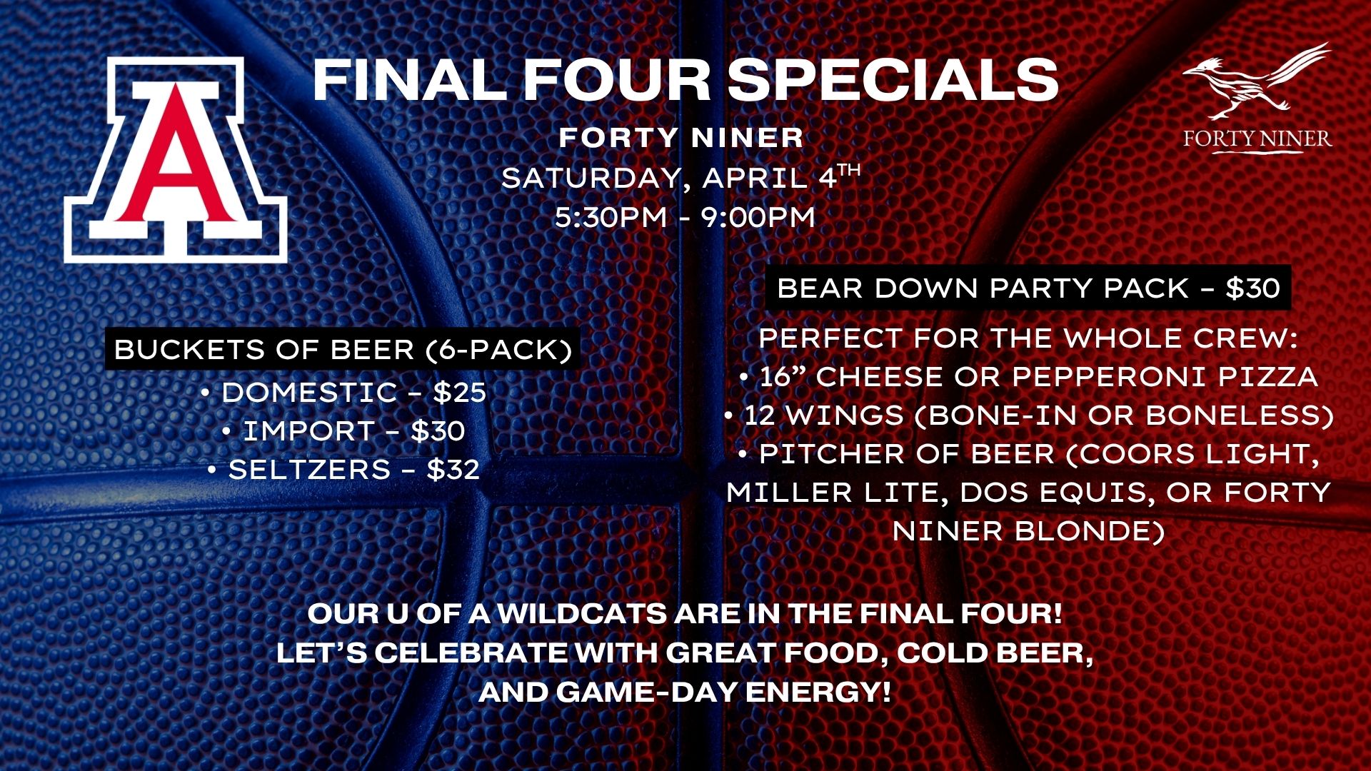 The Final Four is here, and there’s no better place to catch the action than Forty Niner! Join us as we cheer on our U of A Wildcats with an evening full of game-day energy, great food, and ice-cold drinks. … Read More
